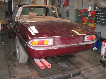 My choice of colour now presented problems as Damson was not listed on the paint suppliers' databases. The first batch was too brown - it made the underside look like a chocolate biscuit: definitely not what I had been trying to achieve. Fortunately the problem was recognised very quickly, before too much had been painted. The first picture below is of Jason applying primer to the underside of the car before it was finally painted body colour. As originally supplied the car had been painted Russet Brown but had mostly been resprayed in white on at least two occasions but missing the underside of the tonneau cover which remained Russet Brown. A personal and very subjective opinion is that dark colours suit the Stag better than light ones. In making my choice I had considered reds, blues and greens before eventually deciding on Damson. A visit on 5 January 2008 saw the car resplendent in its new colour and looking every bit as good as I'd hoped for but visiting again on 9 February 2008 when the car was outside made the colour look different. By this time the engine was built and ready for fitting: the heads on the original engine had corroded so badly that they couldn't be taken off the engine block so another block and heads were used. The front and rear suspension components had been refurbished with polyurethane bushes used throughout so the car could now stand on wheels again - a big milestone reached! |